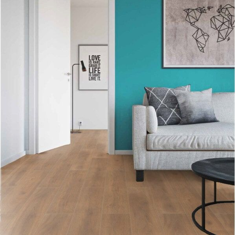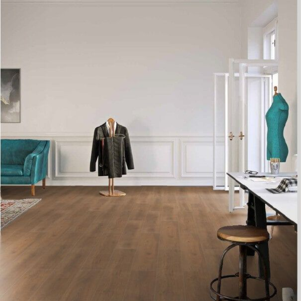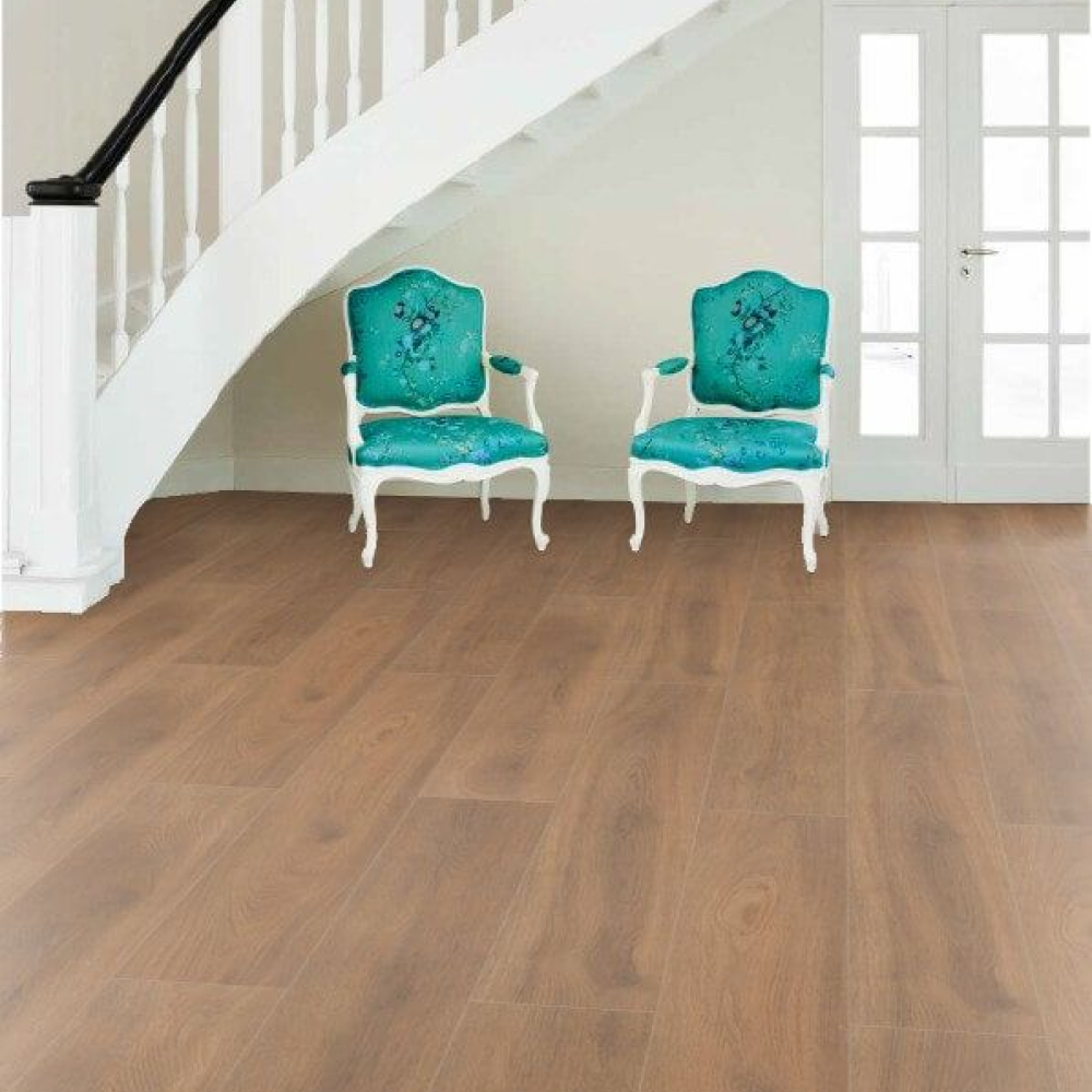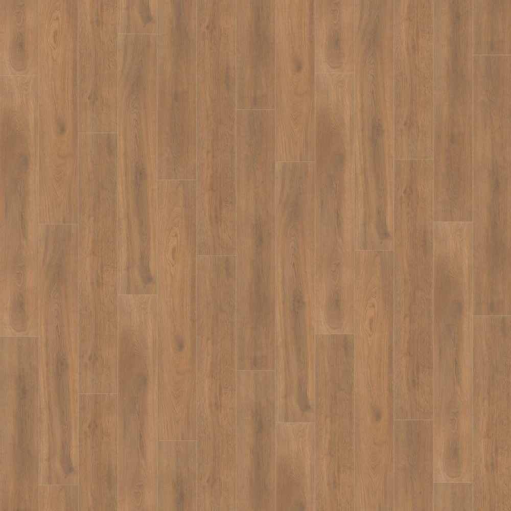 Декор выполнен в формате длинной широкой доски с использованием синхронного тиснения, которое отлично воспроизводит структуру натуральной древесины в темно-коричневых оттенках. Доска крупного формата имеет влагозащищенную фаску по четырем сторонам с лаковым покрытием в цвет декора. Фаски имеют глубину 1,5 мм и визуально расширяют пространство любых помещений.