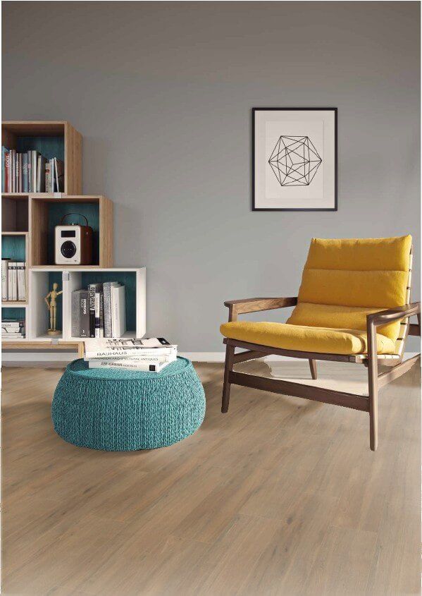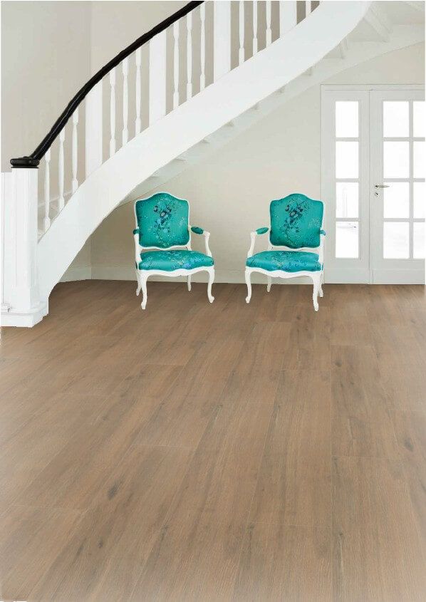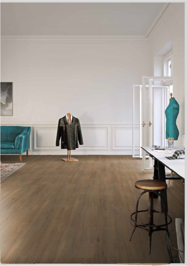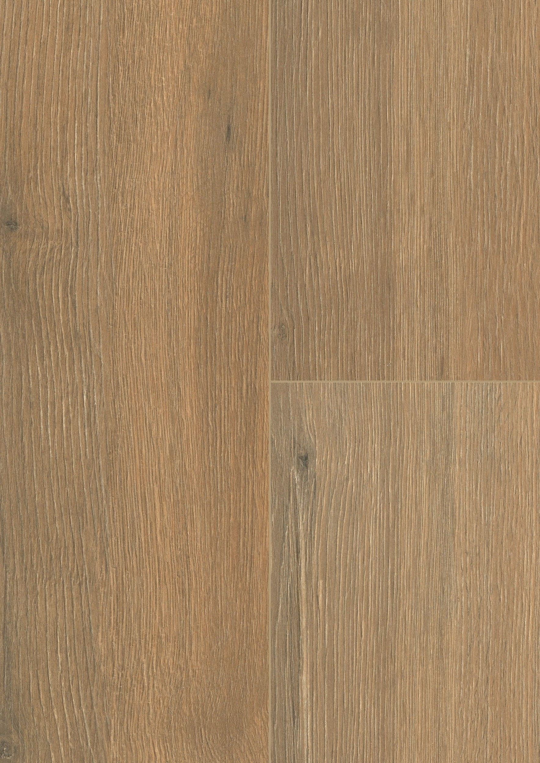Декор выполнен в формате длинной широкой доски с использованием синхронного тиснения, которое отлично воспроизводит структуру натуральной древесины в темно-коричневых оттенках. Доска крупного формата имеет влагозащищенную фаску по четырем сторонам с лаковым покрытием в цвет декора. Фаски имеют глубину 1,5 мм и визуально расширяют пространство любых помещений.