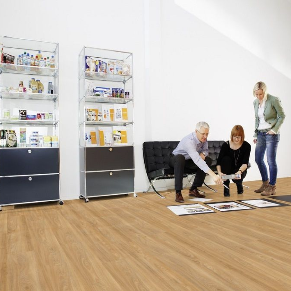 Укладка винилового пола производится клеевым способом и не занимает много времени. С этим может справиться один человек. Основание перед укладкой должно быть сухим, чистым и ровным. Бетонное основание необходимо предварительно прогрунтовать влагостойкой акриловой грунтовкой. Перед укладкой ламинат должен пройти акклиматизацию в помещении, где он будет монтироваться. Можно использовать с низкотемпературным подогревом пола любого типа с температурой не выше +27С.