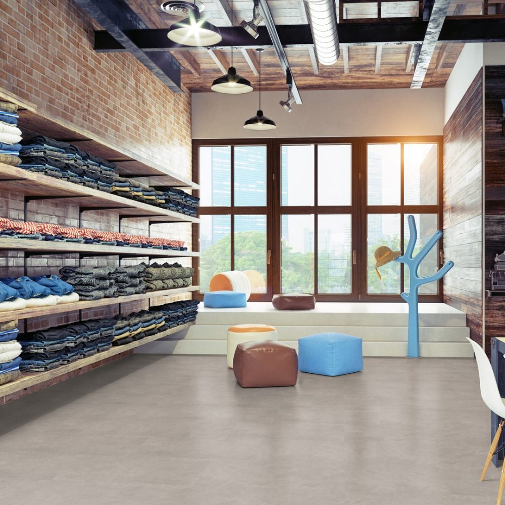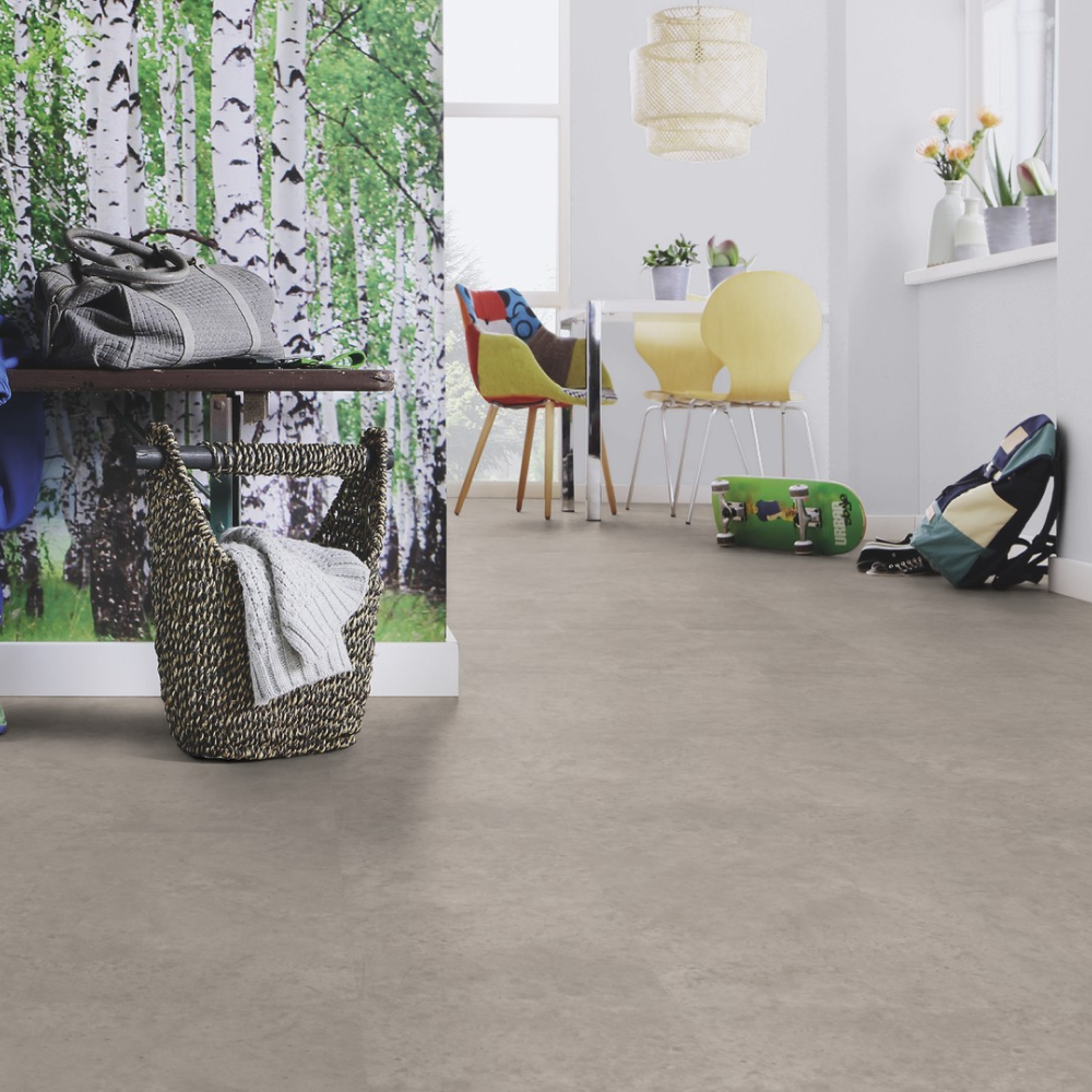 Виниловый пол Wineo Stone Vision Concrete Chill DB00135 — стильный декор под плитку в светло-серых оттенках. Высокие показатели износостойкости и водостойкости позволяют укладывать полы в помещениях с постоянным потоком людей. К таким помещениям можно отнести рестораны, гостиничные комплексы, а также магазины и спортивные центры.