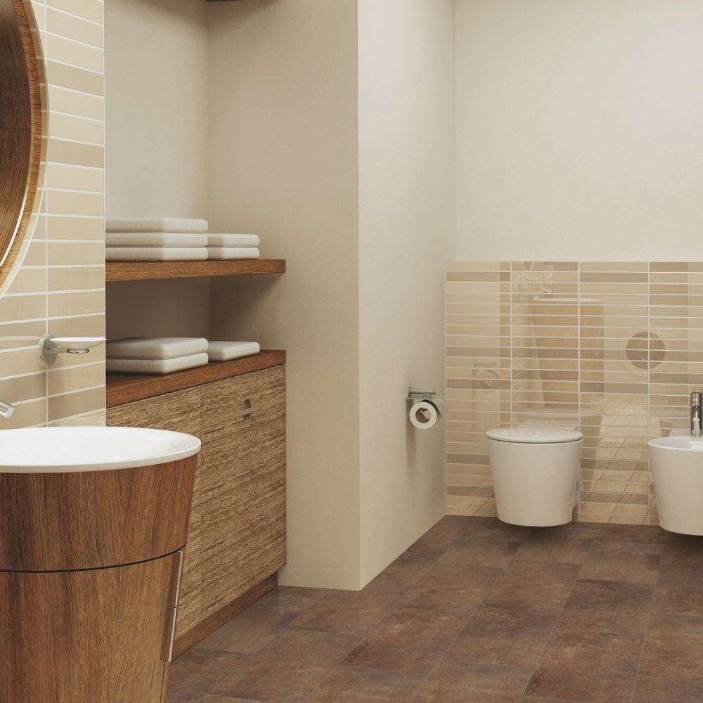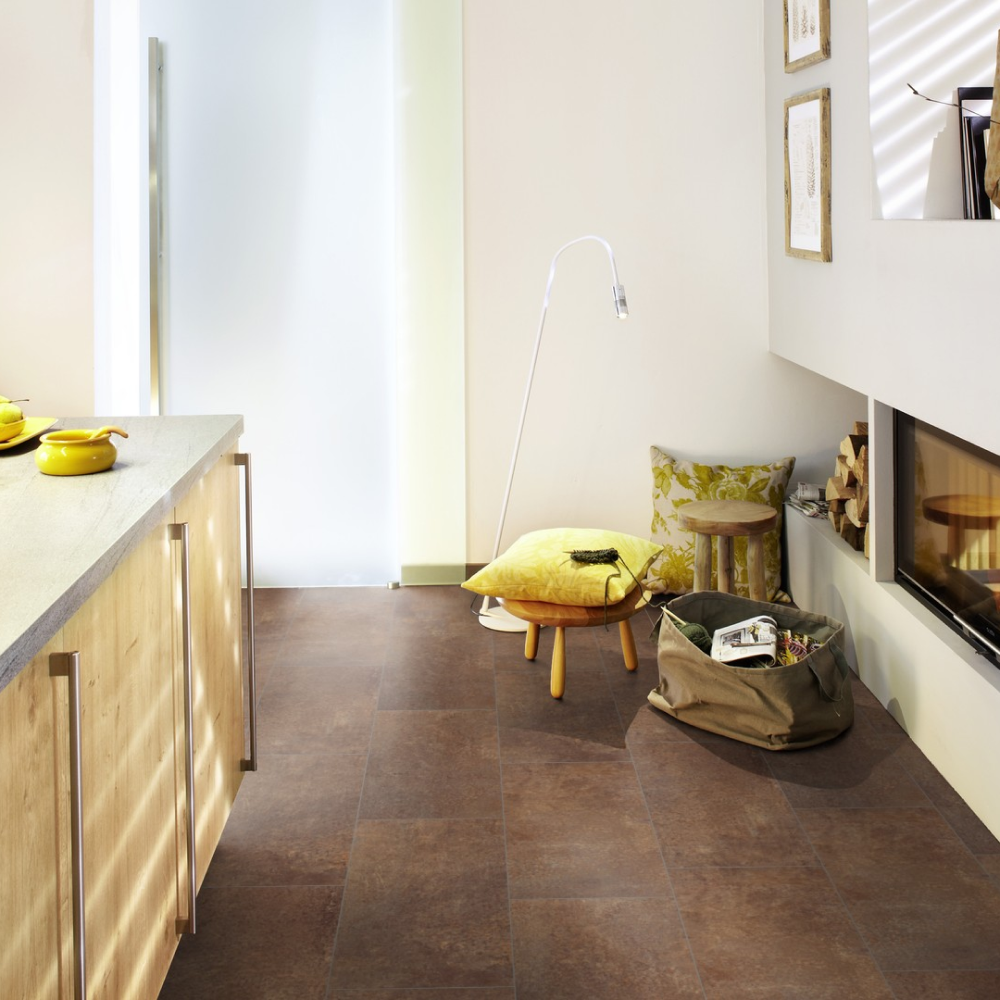 Виниловый пол Wineo Fortune Stone Rusty DLC00143 — стильный декор под плитку в темно-коричневых оттенках. Высокие показатели износостойкости и водостойкости позволяют укладывать полы в помещениях с постоянным потоком людей. К таким помещениям можно отнести рестораны, гостиничные комплексы, а также магазины и спортивные центры.