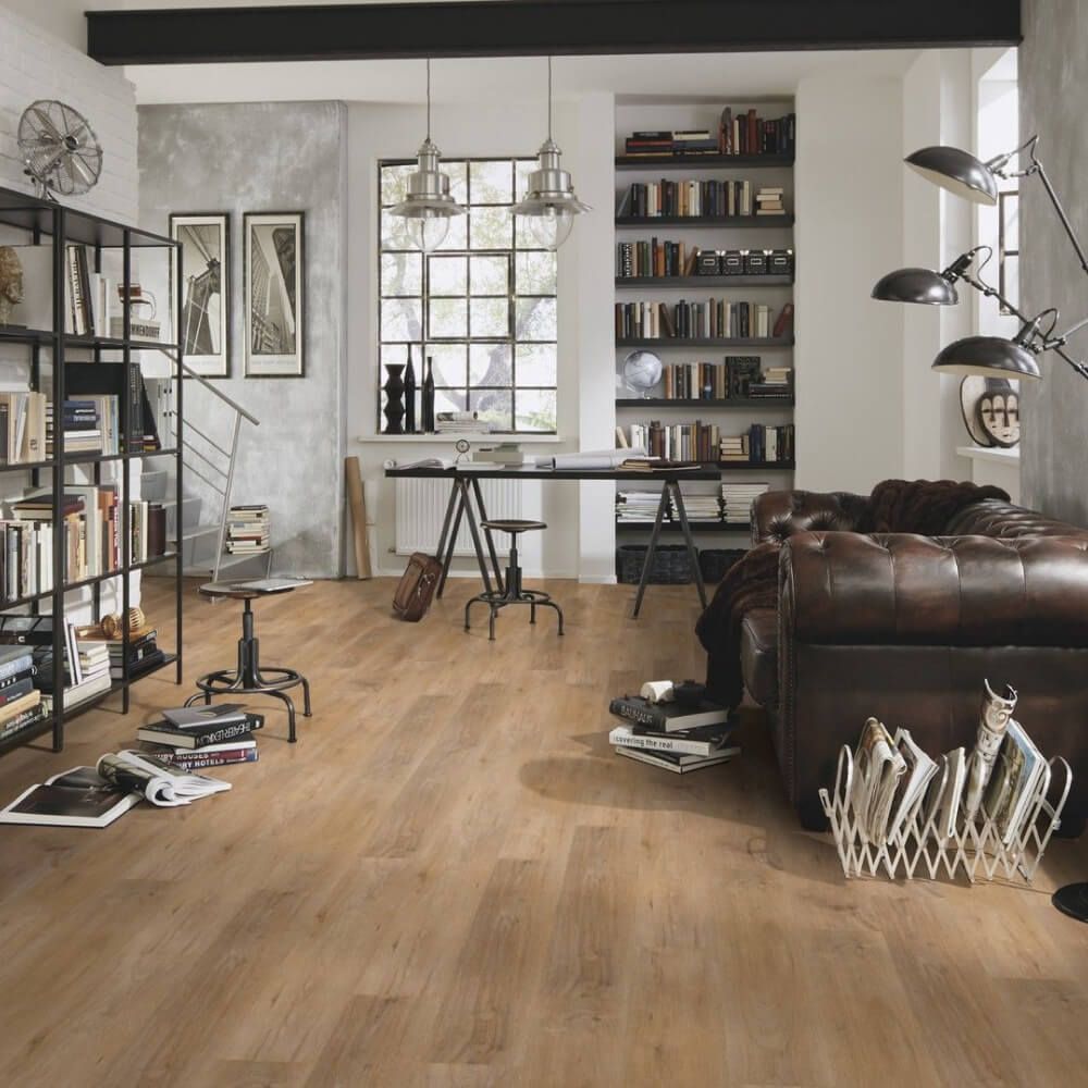 Дома виниловые полы прекрасно смотрятся в кабинете, коридоре, на кухне и в гостиной,а устойчивость к воде позволит использовать их для интерьера ванной комнаты.