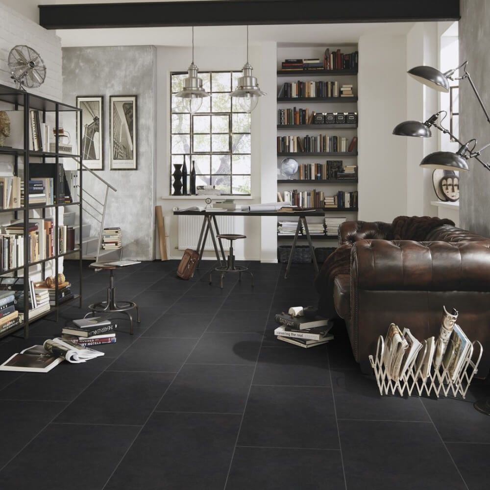 Виниловый пол 800 Stone Dark Slate DLC00085 — стильный декор под плитку с черным оттенком и рельефным воспроизведением фактуры камня с микрофаской по периметру.