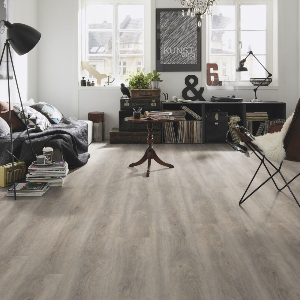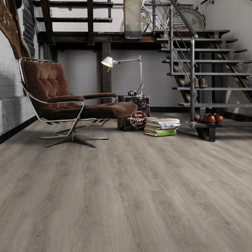 Виниловый пол Wineo Memory Oak Silver DB00132 — стильный декор в темно-серых оттенках дуба крупного формата. Высокие показатели износостойкости и водостойкости позволяют укладывать полы в помещениях с постоянным потоком людей. К таким помещениям можно отнести рестораны, гостиничные комплексы, а также магазины и спортивные центры.