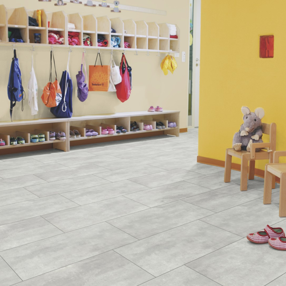 Виниловый пол Wineo Wisdom Concrete Dusky DLC00140 — стильный декор под плитку в светло-серых оттенках. Высокие показатели износостойкости и водостойкости позволяют укладывать полы в помещениях с постоянным потоком людей. К таким помещениям можно отнести рестораны, гостиничные комплексы, а также магазины и спортивные центры.